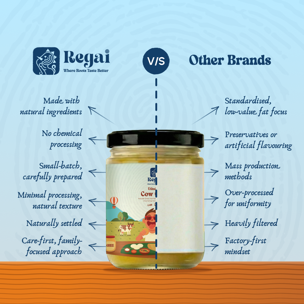 Regai A2 Cow Ghee is made from native cow milk sourced from Uthukuli, Tamil Nadu — a region long known for its ghee-making tradition. Prepared using time-tested methods, this ghee has a natural golden colour, a soft grainy texture, and a comforting aroma that instantly reminds you of festival mornings and paati’s kitchen.Made without shortcuts, additives, or artificial processing, this ghee reflects how desi ghee has been prepared and trusted in Indian homes for generations — simple, pure, and deeply familiar.