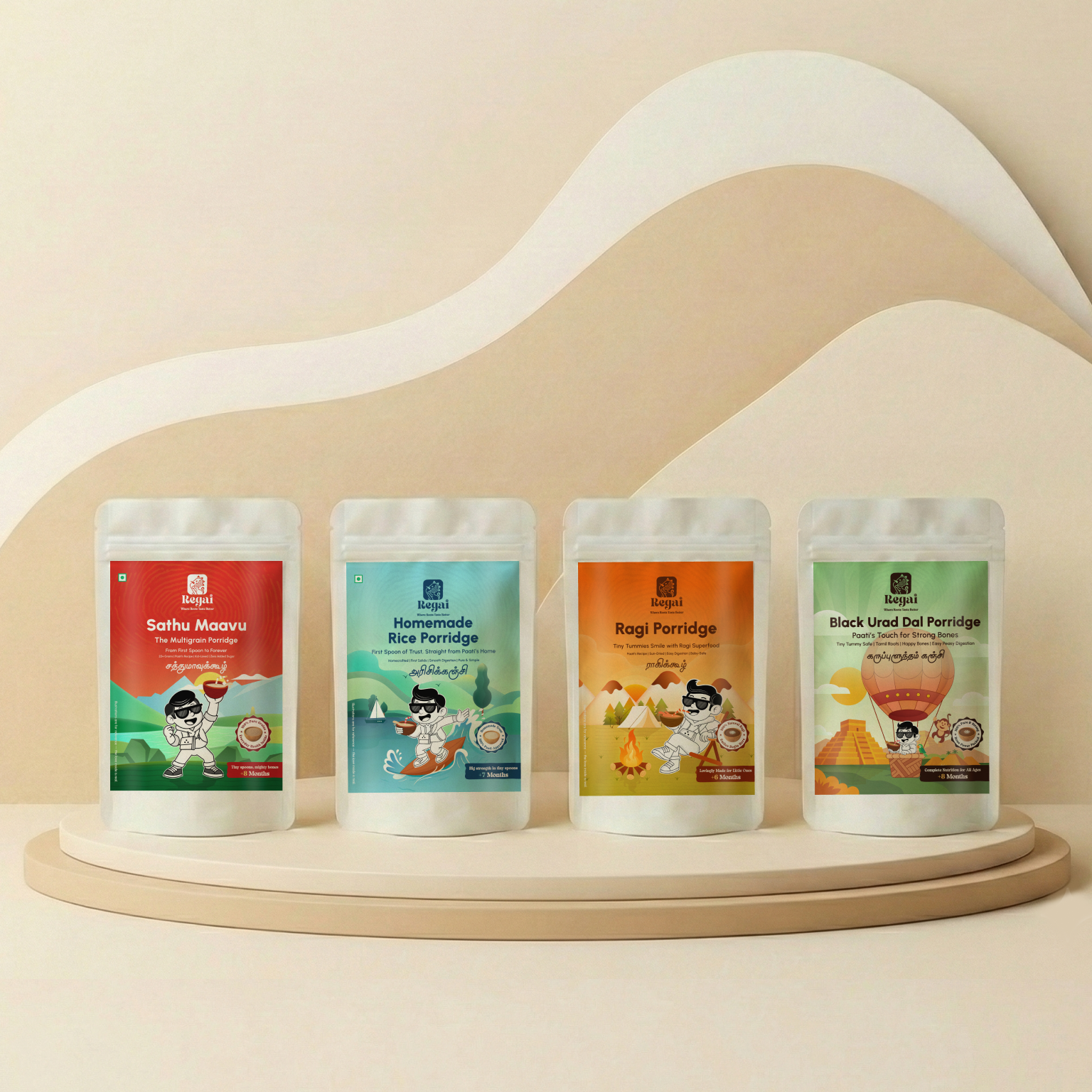 The Regai Superfood Starter Collection brings together four of our most loved traditional porridge mixes in easy trial sizes. Designed for first-time buyers and growing families, this pack allows you to experience different grains, textures, and flavours before committing to larger quantities. Each mix is prepared the paati way, using familiar ingredients and modern safety standards, making it a simple starting point for everyday nourishment at home.